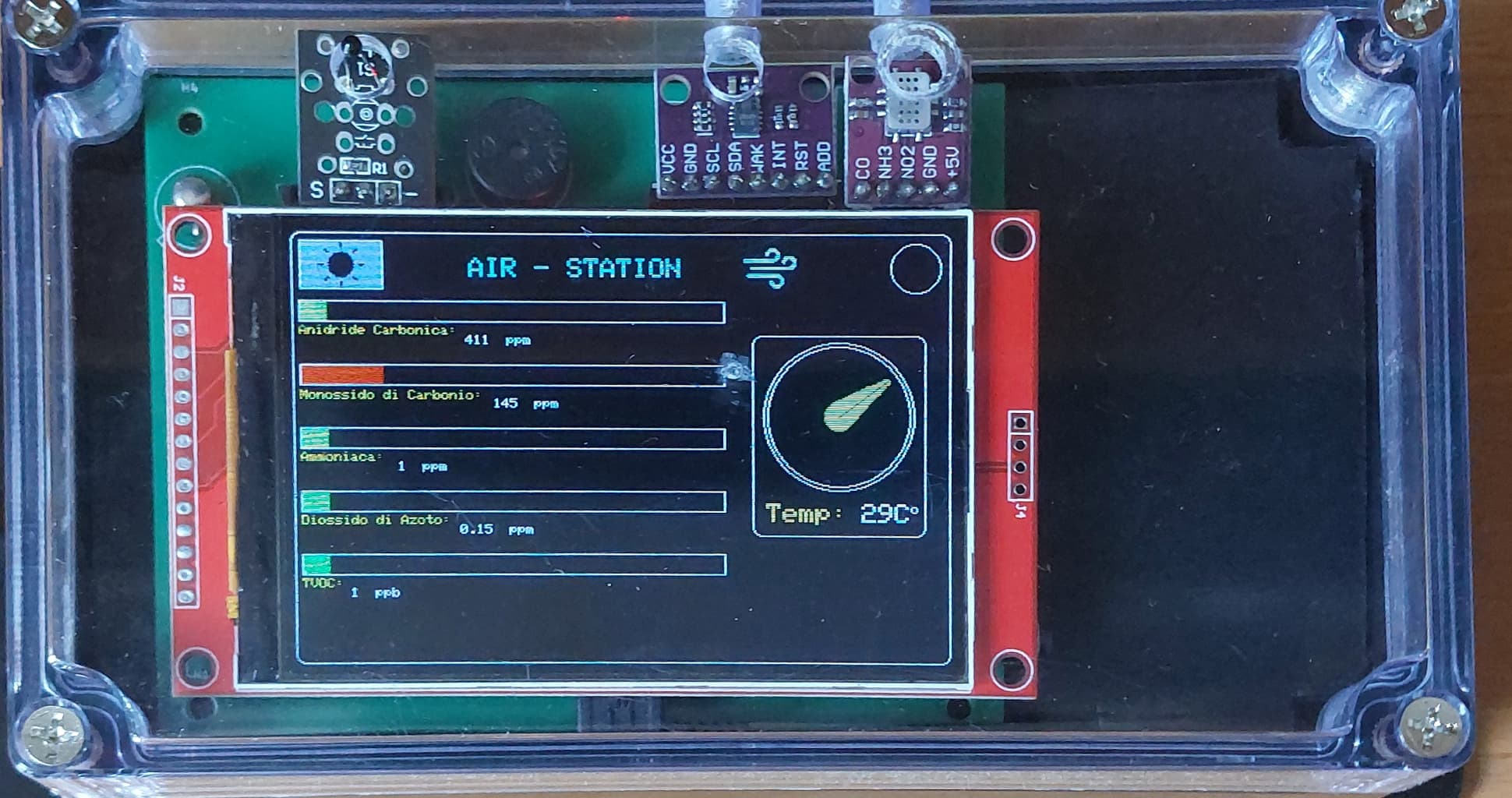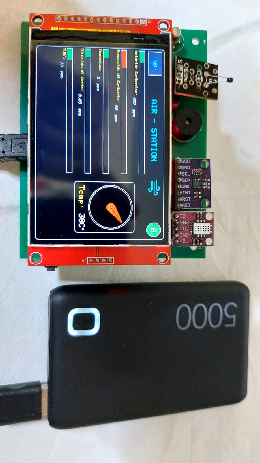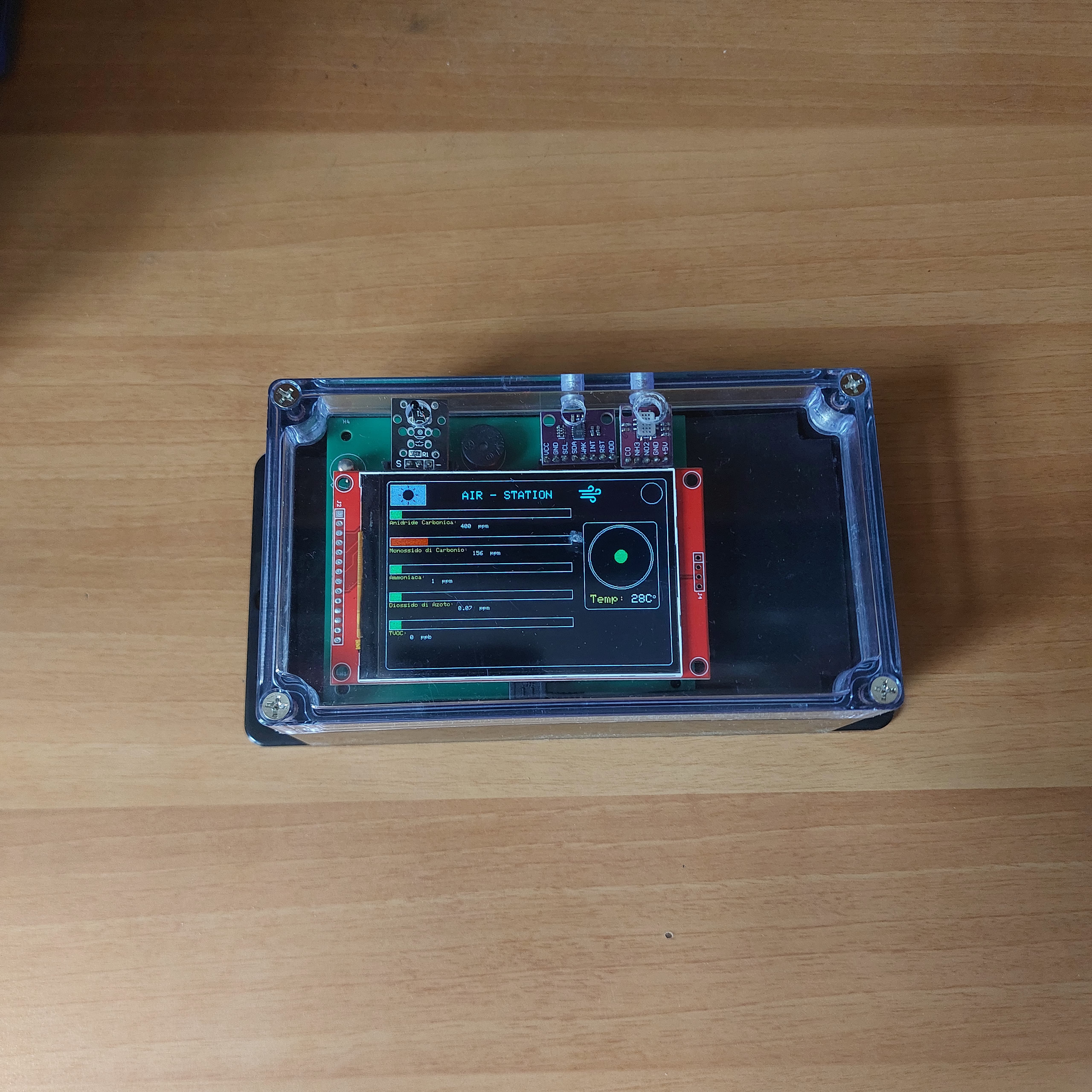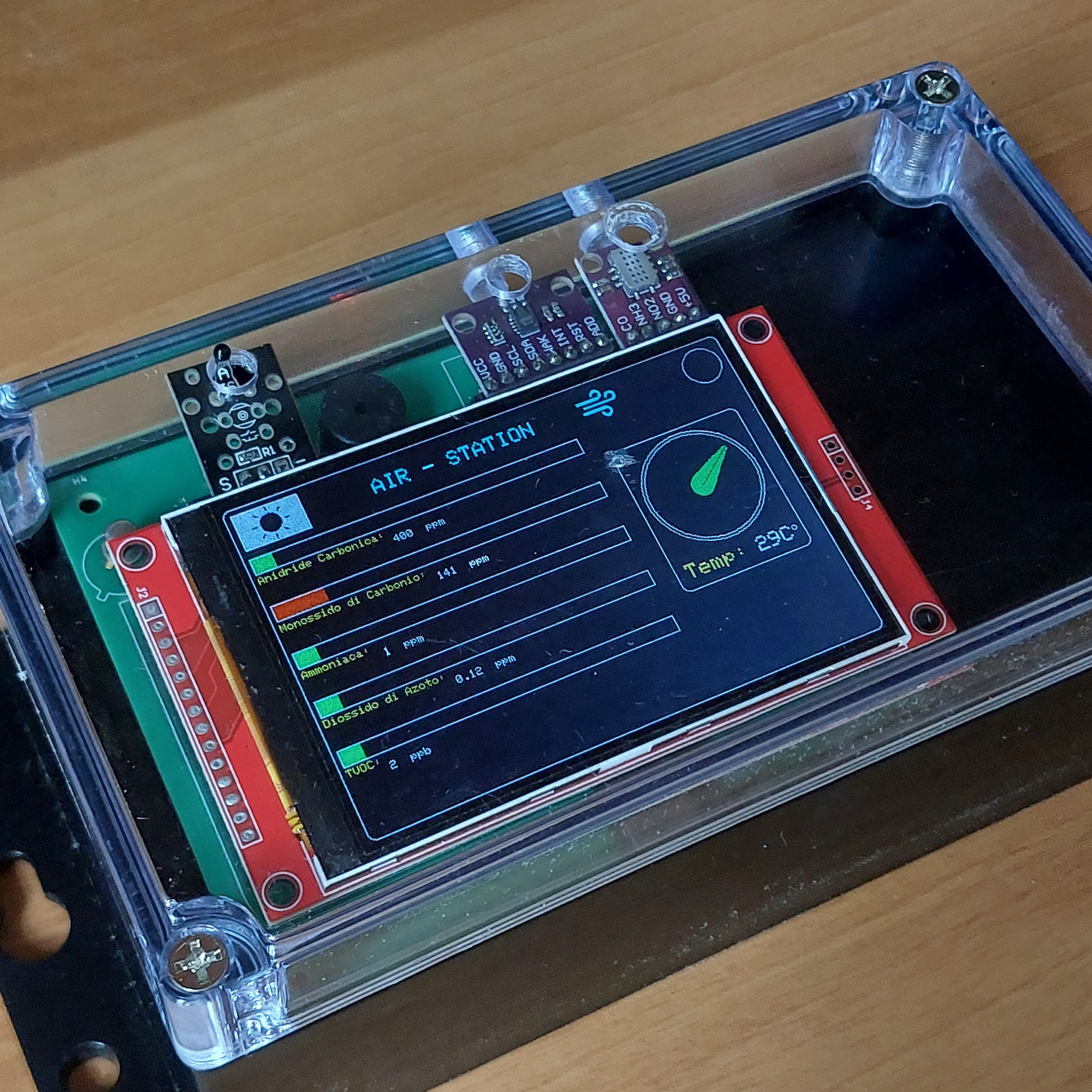 AirStation è una stazione autonoma per il monitoraggio della qualità dell’aria e della temperatura. Utilizza i sensori CCS811 e MiCS-6814 per rilevare gas nocivi come CO₂, TVOC, CO, NO₂ e NH₃. È presente anche un sensore analogico di temperatura che misura i gradi ambientali, visualizzati in tempo reale sul display TFT da 480x320 pixel. I dati vengono gestiti da un Arduino Nano, e un buzzer segnala condizioni critiche. Il dispositivo è standalone, compatto e subito pronto all’uso senza bisogno di collegamenti esterni.
